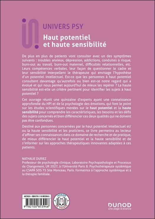 Les questions du haut potentiel et de la haute sensibilité sont de plus en plus médiatisées, avec le risque de faire naître des stéréotypes. Cependant s’il y a bien sûr un grand nombre de sujets HPI qui vivent heureux et qui ne consultent pas, d'autres patients HPI souffrent des troubles suivants : troubles anxieux, dépression, addictions, conduites à risque, burn out au travail, burn out maternel, difficultés relationnelles, etc. Cet ouvrage fait le point sur l’état de la recherche actuelle sur le haut potentiel et la haute sensibilité et réfléchit à des modèles de prise en charge adaptés aux spécificités de ces patients avec un QI élevé et/ou une haute sensibilité.