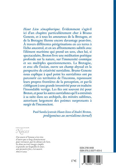 Avec l’intuition et le lyrisme qu’on lui connait mais également une approche aussi poétique que savante du surréalisme, Bruno Geneste entreprend, dans ce nouveau livre, d’explorer les « Hauts-Lieux » à la fois matériels et « immatériels » qui ont jalonné le parcours d’André Breton. De Saint-Cirq- Lapopie, où il disait avoir « cessé de se désirer ailleurs » et où j’ai eu, moi, le plaisir, avant les travaux de restauration de l’auberge des Mariniers dont il avait fait l’acquisition, de discuter avec quelques amis de l’esprit du surréalisme, comme je l’ai raconté ailleurs, dans la pièce même où il réunissait, l’été, ses compagnons et où flottait encore quelque chose, dans l’air, de sa présence pourtant déjà lointaine, de Saint-Cirq, donc, à sa chère Bretagne, de Nantes à Brocéliande et aux îles, en passant par le Rocher Percé, en Gaspésie, les réserves Hopis et Zunis ou la Casa Azul de Frida Kahlo, le Pic du Teide ou le gouffre d’Absalon. Dans « Les Hauts lieux d’André Breton » Bruno évoque la passion de Breton pour le celtisme, pour « l’Hermétisme alchimique », pour la révolte anticoloniale et anticolonialiste, celle en particulier de ce « Noir qui est non seulement un Noir, mais tout l’homme », Aimé Césaire… (extrait postface Patrick Lepetit)