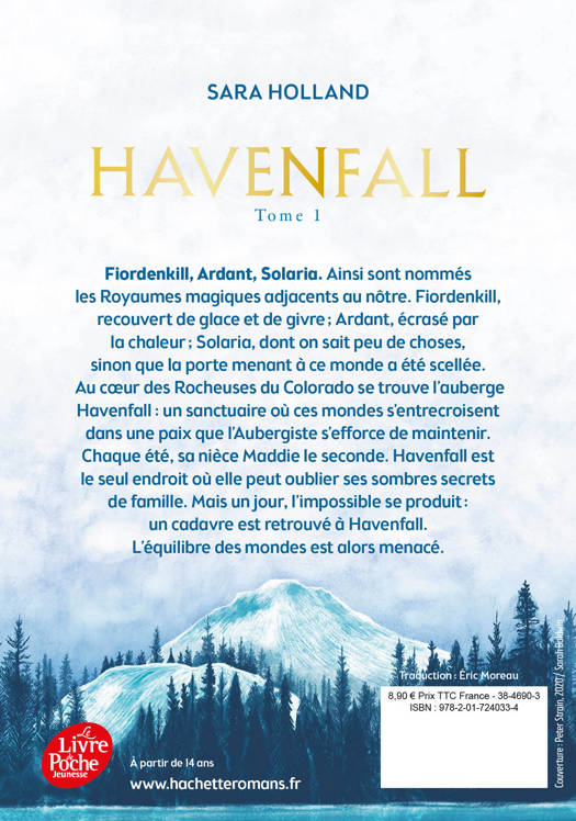 Fiordenkill, Ardant, Solaria. Ainsi sont nommés les Royaumes magiques voisins du nôtre. Fiordenkill, recouvert de glace et de givre ; Ardant, écrasé par la chaleur ; et Solaria, dont la porte a été scellée pour empêcher les créatures bestiales qui l’habitent d’en sortir. Au cœur des Rocheuses du Colorado se trouve l’auberge Havenfall : un sanctuaire où ces mondes s’entrecroisent et où l’Aubergiste oeuvre pour maintenir la paix entre eux. Chaque été, sa nièce Maddie vient l’épauler. Havenfall est le seul endroit où elle peut oublier ses sombres secrets de famille. Jusqu’au jour où l’impossible se produit : Maddie trouve la porte de Solaria ébréchée et son oncle inconscient. Le fragile équilibre entre les mondes est alors menacé. À mesure que les masques tombent, Maddie prend conscience qu’elle ne peut compter que sur elle-même pour restaurer la paix des Royaumes… et les sauver.