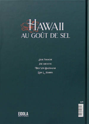 Hawaï au goût de sel c'est l'histoire d'un pêcheur qui, le temps d'une nuit, part à la rencontre de Mano la bleue, femme requin aussi attirante que menaçante. Ce sont la poésie et l'amour de la nature des textes de Julie Nakache, en français et en anglais, traduits par le romancier Eddy L. Harris. Ce sont aussi les illustrations de Zoé Crevette qui révèlent la petitesse et la vulnérabilité de notre pêcheur entre les mains titanesques de Namaka, déesse hawaïenne de l'eau et de la mer. Elles témoignent de la dualité d'une faune à la fois magnifique et féroce, où au bleu-vert de l'océan Pacifique vient se joindre le rouge du sang. Ce sont enfin des compositions musicales originales de Troy Von Balthazar qui mêlent sa voix au ukulélé, au violoncelle, au dundun mais aussi au bruit des vagues pour nous transporter sur ces îles du Pacifique où il a grandit, et une lecture contée par Julie Nakache sur fond musical. Les morceaux et la lecture sont accessibles grâce à des QR codes.