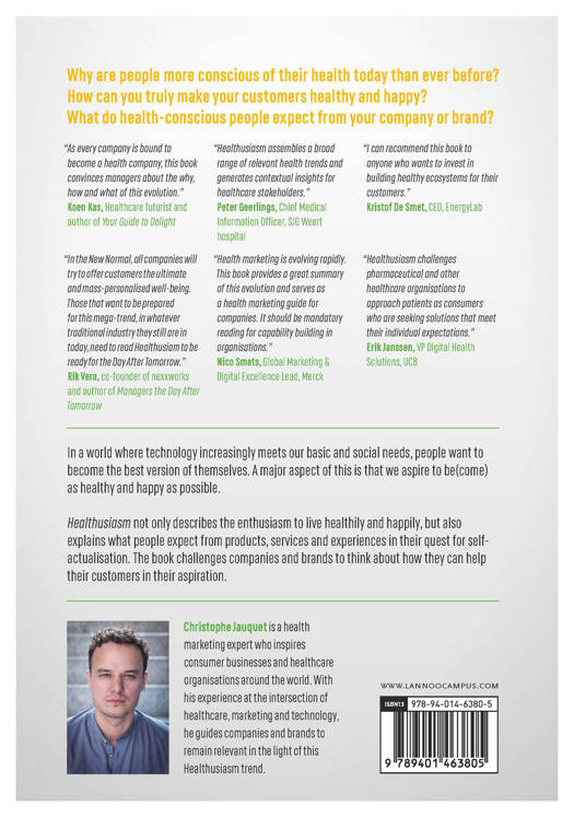 Why are people more conscious of their health today than ever before? How can you truly make your customers healthy and happy? What do health-conscious people expect from your company or brand? In a world where technology increasingly meets our basic and social needs, people want to become the best version of themselves. A major aspect of this is that we aspire to be(come) as healthy and happy as possible. Healthusiasm not only describes the enthusiasm to live healthily and happily, but also explains what people expect from products, services and experiences in their quest for selfactualisation. The book challenges companies and brands to think about how they can help their customers in their aspiration.