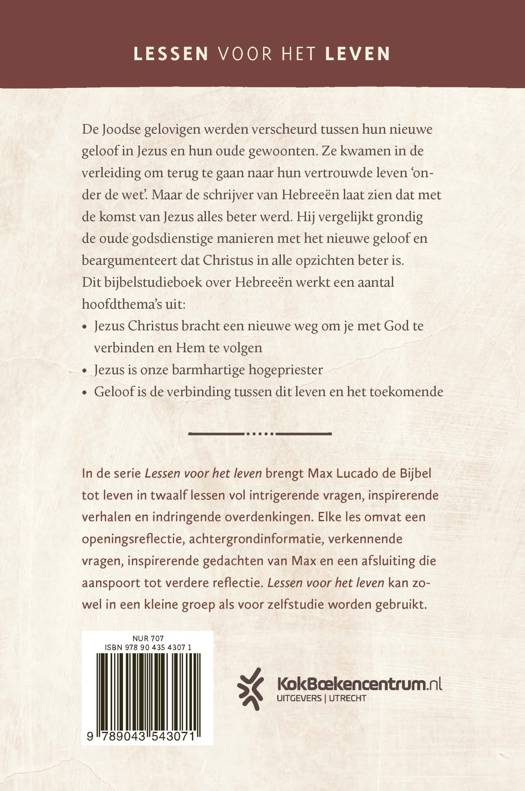‘Lessen voor het leven’ is een serie bijbelstudies van Max Lucado, waarin de auteur een bijbelboek uitdiept. ‘Hebreeën’ neemt de lezer mee naar de tijd van de eerste christelijke gemeenten. De Joodse gelovigen werden verscheurd tussen hun nieuwe geloof in Jezus en hun oude gewoonten. Ze kwamen in de verleiding om terug te gaan naar hun vertrouwde leven dat goed genoeg leek. Maar de schrijver van Hebreeën laat zien dat met de komst van Jezus het beste beter werd. Hij vergelijkt grondig de oude manieren met het nieuwe geloof en beargumenteert dat Christus in alle opzichten beter is. De bijbelstudies zijn geschikt voor zelfstandig gebruik of in groepen.