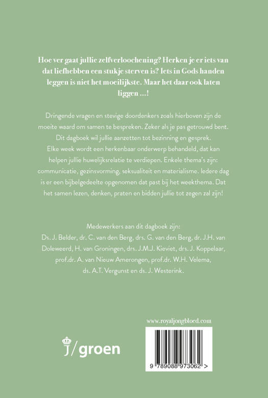 Dit dagboek is allereerst bedoeld voor mannen en vrouwen van wie de trouwdag nog niet zo ver achter hen ligt. Opzet, thematiek, stijl en inhoud zijn afgestemd op deze doelgroep. Uitgangspunt is verdieping te mogen aanbrengen in denken, huwelijks- en gezinsleven. Elf auteurs uit vier kerkverbanden zetten hun schouders onder dit streven. Het resultaat mag er zijn: pakkende, inspirerende en praktische bijbeloverdenkingen, en verdiepende vragen die aanzetten tot bezinning en gesprek. De thema's zijn herkenbaar voor lezers aan het begin van hun huwelijksweg. Al met al een waardevol dagboek om zelf aan te schaffen of om cadeau te doen.