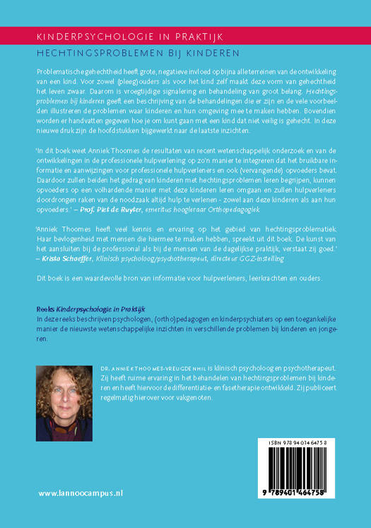 Hechtingsproblemen bij kinderen geeft een beschrijving van de behandelingen die er zijn en de vele voorbeelden illustreren de problemen waar kinderen en hun omgeving mee te maken hebben. Bovendien worden er handvatten gegeven hoe je om kunt gaan met een kind dat niet veilig is gehecht. In deze nieuwe druk zijn de hoofdstukken bijgewerkt naar de laatste inzichten.