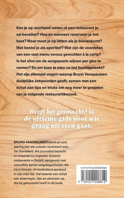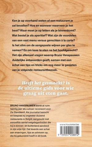 Kan je op voorhand weten of een restaurant je zal bevallen? Hoe en wanneer reserveer je het best? Waar moet je op letten als je binnenkomt? Wat bestel je als aperitief? Wat zijn de voordelen van een vast menu versus gerechten à la carte? Is het slim om de aangepaste wijnen per glas te nemen? En om kaas te eten na het hoofdgerecht? Het zijn allemaal vragen waarop Bruno Vanspauwen duidelijke antwoorden geeft, samen met een schat aan tips en tricks om nog meer te genieten van je volgende restaurantbezoek. 'Heeft het gesmaakt?' is de ulteme gids voor wie graag uit eten gaat.