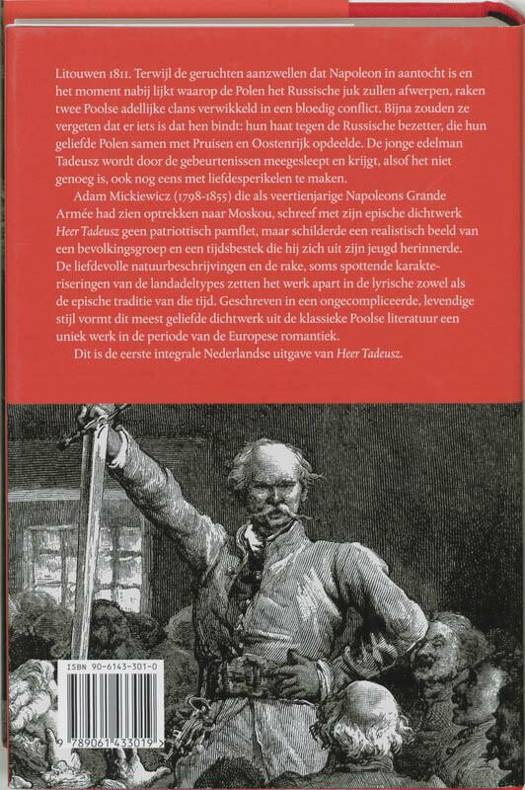 Hét grote klassieke Poolse dichtwerk Pan Tadeusz, geschreven door de Poolse Goethe Adam Mickiewicz is nu eindelijk ook in het Nederlands beschikbaar. Mickiewicz (1798-1855) schreef Heer Tadeusz in de jaren 1832-1834 in Parijs, tijdens zijn verbanning. Hij situeerde Heer Tadeusz in het Litouwen van zijn jeugd, als Napoleon in aantocht is en eindelijk het moment nabij lijkt waarop de Polen het Russische juk zullen afwerpen. Maar dan raken twee Poolse adellijke clans verwikkeld in een bloedig conflict. Een mysterieuze monnik duikt op die de krachten van de vechtenden tracht te bundelen tegen de gehate Russische bezetter. De jonge edelman Tadeusz wordt door de gebeurtenissen meegesleept en ook wordt hij verliefd.