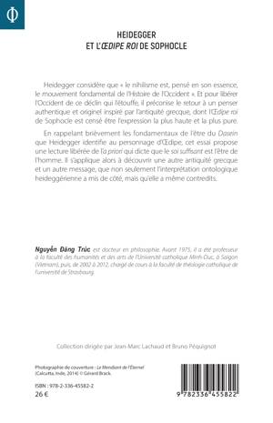 Heidegger considère que le nihilisme est, pensé en son essence, le mouvement fondamental de l'Histoire de l'Occident . Et pour libérer l'Occident de ce déclin qui l'étouffe, il préconise le retour à un penser authentique et originel inspiré par l'antiquité grecque, dont l'OEdipe roi de Sophocle est censé être l'expression la plus haute et la plus pure. En rappelant brièvement les fondamentaux de l'être du Dasein que Heidegger identifie au personnage d'OEdipe, cet essai propose une lecture libérée de l'a priori qui dicte que le soi suffisant est l'être de l'homme. Il s'applique alors à découvrir une autre antiquité grecque et un autre message, que non seulement l'interprétation ontologique heideggérienne a mis de côté, mais qu'elle a même contredits.