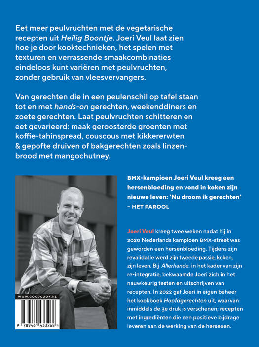 Eet meer peulvruchten met de vegetarische recepten uit Heilig Boontje. Joeri Veul laat zien hoe je door kooktechnieken, het spelen met texturen en verrassende smaakcombinaties eindeloos kunt variëren met peulvruchten, zonder gebruik van vleesvervangers.