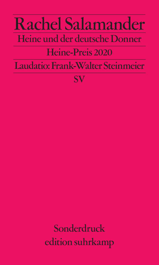 Seit 1972 gehört der Heinrich-Heine-Preis der Stadt Düsseldorf zu den bedeutendsten Literatur- und Persönlichkeitspreisen der Bundesrepublik. Ausgezeichnet wurden bisher u. a. Amos Oz und Jürgen Habermas. Im Jahr 2020 erhielt die Literaturwissenschaftlerin und Publizistin Rachel Salamander den Preis. Die Jury würdigte damit ihren Beitrag zum »Wiederaufbau des jüdischen intellektuellen Lebens nach dem Zweiten Weltkrieg«. Der Band dokumentiert die Rede der Preisträgerin sowie die Laudatio von Bundespräsident Frank-Walter Steinmeier. Salamander stellt Heinrich Heine an den Anfang der deutsch-jüdischen Literatur. Seine klarsichtige, im Jahr 1834 formulierte Warnung vor dem »deutschen Donner« ist in einer Zeit kontroverser Debatten über den Antisemitismus von beunruhigender Aktualität.