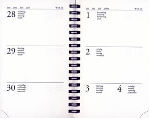 Artikelcode: KA26890 Specificaties: Harde kaft Door ringband volledig omklapbaar 128 pagina's Voorzien van afscheurbare perforatiehoeken 1 week per 2 pagina's Ruimte voor notities Formaat: 15,5 x 10,5 cm (A6) Gewicht: 124 gr