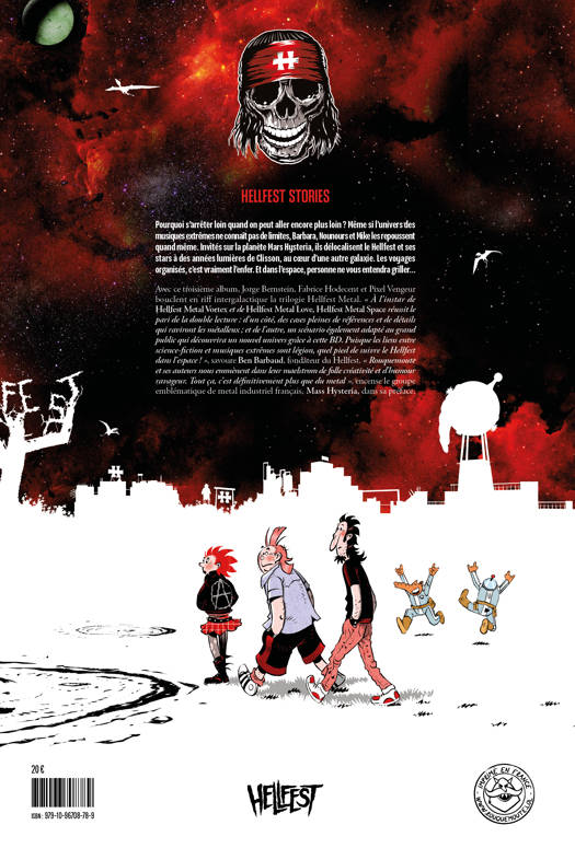 Avec ce troisième album, Jorge Bernstein, Fabrice Hodecent et Pixel Vengeur bouclent en riff intergalactique la trilogie Hellfest Metal. “À l’instar de Hellfest Metal Vortex et de Hellfest Metal Love, Hellfest Metal Space réussit le pari de la double lecture : d’un côté, des cases pleines de références et de détails qui raviront les métalleux ; et de l’autre, un scénario également adapté au grand public qui découvrira un nouvel univers grâce à cette BD. Puisque les liens entre science-fiction et musiques extrêmes sont légion, quel pied de suivre le Hellfest dans l’espace !”, savoure Ben Barbaud, fondateur du Hellfest. “Rouquemoute et ses auteurs nous emmènent dans leur maelstrom de folle créativité et d’humour ravageur. Tout ça, c’est définitivement plus que du metal”, encense le groupe emblématique de metal industriel français, Mass Hysteria, dans sa préface.