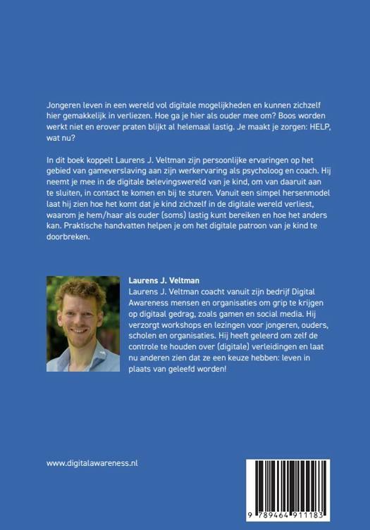 ‘HELP! Mijn kind verdwijnt in social media of gamen’ geeft antwoord op deze vragen. In dit boek koppelt Laurens J. Veltman zijn persoonlijke ervaringen op het gebied van gameverslaving aan zijn professie als psycholoog en coach. Vanuit een simpel hersenmodel neemt Laurens je mee in de digitale belevingswereld van je kind. Hij laat zien hoe het komt dat je kind zichzelf in de digitale wereld verliest, waarom je hem/haar als ouder (soms) lastig kunt bereiken en hoe het anders kan. Praktische handvatten helpen je om het digitale patroon van je kind te doorbreken!