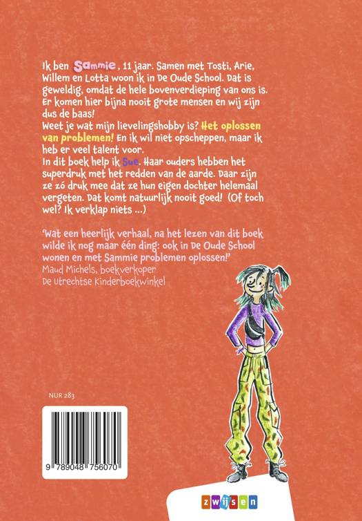 Ik ben Sammie, 11 jaar. Samen met Tosti, Arie, Willem en Lotta woon ik in De Oude School. Dat is geweldig, omdat de hele bovenverdieping van ons is. Er komen hier haast nooit grote mensen en wij zijn dus de baas! Weet je wat mijn lievelingshobby is? Het oplossen van problemen! En ik wil niet opscheppen, maar ik heb er veel talent voor. In dit boek help ik Sue. Haar ouders hebben het superdruk met het redden van de aarde. Daar zijn ze zó druk mee dat ze hun eigen dochter helemaal vergeten. Dat komt natuurlijk nooit goed! (Of toch wel? Ik verklap niets …)
