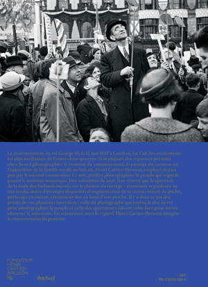 À la veille du couronnement de Charles III le 6 mai 2023, c'est à un autre couronnement que nous invite Henri Cartier-Bresson. Le 12 mai 1937 le jeune reporter est à Londres pour couvrir le couronnement du Roi George VI. Il y fait alors le choix radical de ne pas photographier la famille royale mais le peuple massé pour assister à l'événement. Tournant le dos au roi et inversant le regard, il réalise d'étonnants portraits de ces "regardeurs". Exposition à la Fondation Henri Cartier-Bresson du 3 mai au 4 septembre 2023.