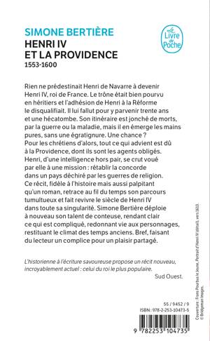 Rien ne prédestinait Henri de Navarre à devenir Henri IV, roi de France. Le trône de France était bien pourvu en héritiers et l’adhésion de Henri à la Réforme le disqualifiait. Il lui fallut pour y parvenir trente ans et une hécatombe. Son itinéraire est jonché de morts, par la guerre ou la maladie. Il en émerge les mains pures, sans une égratignure. Une chance ? Pour les chrétiens d’alors, tout ce qui advient est dû à la Providence, dont ils sont les agents obligés. Henri, d’une intelligence hors pair, se crut voué par elle à une mission : rétablir la concorde dans un pays déchiré par les guerres de religion.
