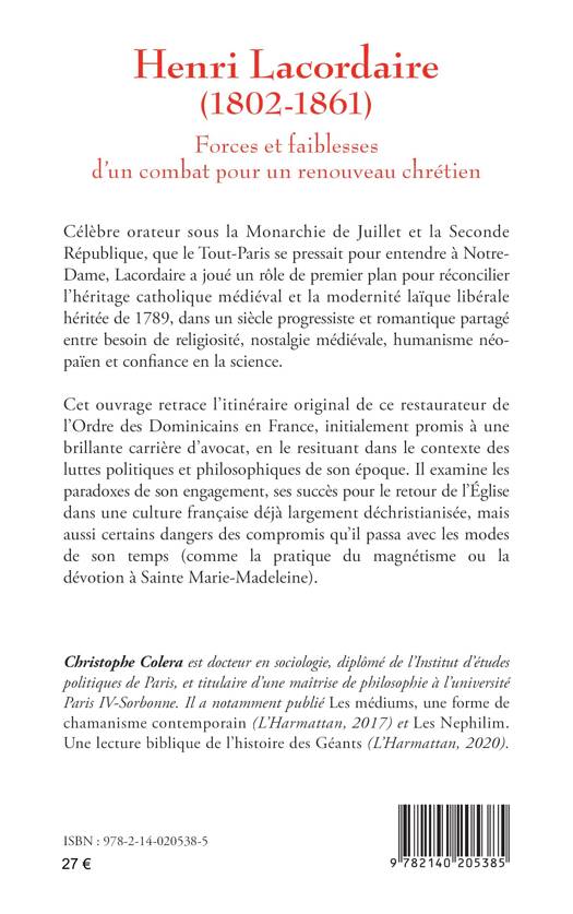 Célèbre orateur sous la Monarchie de Juillet et la Seconde République, Lacordaire a joué un rôle de premier plan pour réconcilier l’héritage catholique médiéval et la modernité laïque libérale héritée de 1789, dans un siècle progressiste et romantique partagé entre besoin de religiosité, nostalgie médiévale, humanisme néo-païen et confiance en la science. Cet ouvrage retrace l’itinéraire original de ce restaurateur de l’Ordre des Dominicains en France, initialement promis à une brillante carrière d’avocat, en le resituant dans le contexte des luttes politiques et philosophiques de son époque. Il examine les paradoxes de son engagement, ses succès pour le retour de l’Église dans une culture française déjà largement déchristianisée, mais aussi certains dangers des compromis qu’il passa avec les modes de son temps.