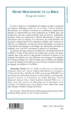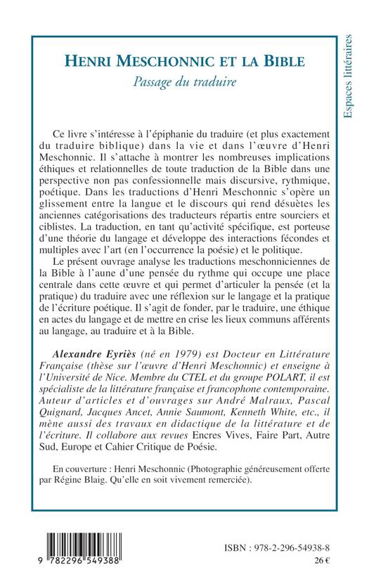 Ce livre s'intéresse à l'épiphanie du traduire (et plus exactement du traduire biblique) dans la vie et l'oeuvre d'Henri Meschonnic. Il s'attache à montrer les nombreuses implications éthiques et relationnelles de toute traduction de la Bible, dans une perspective non pas confessionnelle, mais discursive, rythmique, poétique. Il s'agit de fonder, par le traduire, une éthique en actes du langage et de mettre en crise les lieux communs afférents au langage, au traduire et à la Bible.