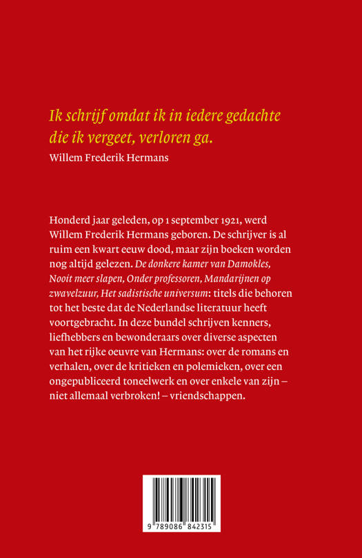 Honderd jaar geleden, op 1 september 1921, werd Willem Frederik Hermans geboren. De schrijver is al ruim een kwart eeuw dood, maar zijn boeken worden nog altijd gelezen. De donkere kamer van Damokles, Nooit meer slapen, Onder professoren, Mandarijnen op zwavelzuur, Het sadistische universum: titels die behoren tot het beste dat de Nederlandse literatuur heeft voortgebracht. In deze bundel schrijven kenners, liefhebbers en bewonderaars over diverse aspecten van het rijke oeuvre van Hermans: over de romans en verhalen, over de kritieken en polemieken, over een ongepubliceerd toneelwerk en over enkele van zijn – niet allemaal verbroken! – vriendschappen.