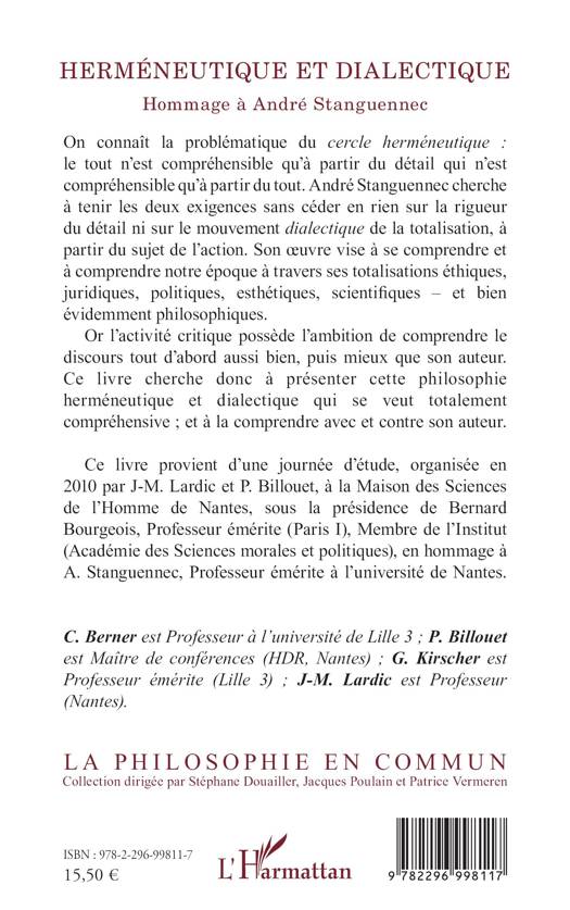 On connaît la problématique du cercle herméneutique : le tout n'est compréhensible qu'à partir du détail qui n'est compréhensible qu'à partir du tout. André Stanguennec cherche à tenir les deux exigences sans céder en rien sur la rigueur du détail ni sur le mouvement dialectique de la totalisation, à partir du sujet de l'action. Son oeuvre vise à se comprendre et à comprendre notre époque à travers ses totalisations éthiques, juridiques, politiques, esthétiques, scientifiques et bien évidemment philosophiques.