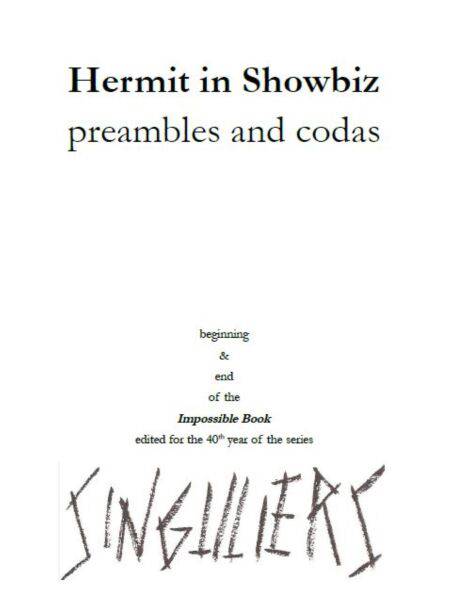 Beginning and end of "Hermit in Showbiz" (Impossible Book)" edited for the 40th year of the series : 30 Preambles to read the 30 Postscripts to the 30 Scenes of "No-Shows No-Film", Codas & "Notes"... "Writing is talking to say nothing".