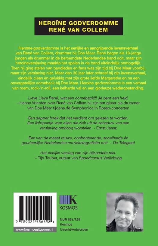 Toen hij ging stelen van bandleden en fans was zijn tijd bij Doe Maar voorbij, maar zijn verslaving niet. Meer dan 30 jaar later schreef hij zijn levensverhaal, eindelijk clean en gelukkig met zijn grote liefde Margaretha en na een onvergetelijke comeback bij Doe Maar. Heroïne godverdomme is een verhaal van roem, rock-`n-roll, een keiharde val en een glorieuze wederopstanding.