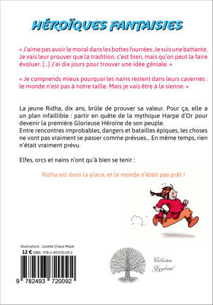 La jeune Ridha, dix ans, brûle de prouver sa valeur. Pour ça, elle a un plan infaillible : partir en quête de la mythique Harpe d’Or pour devenir la première Glorieuse Héroïne de son peuple. Entre rencontres improbables, dangers et batailles épiques, les choses ne vont pas vraiment se passer comme prévu… En même temps, rien n'était vraiment prévu. Elfes, orcs et nains n’ont qu’à bien se tenir : Ridha est dans la place !