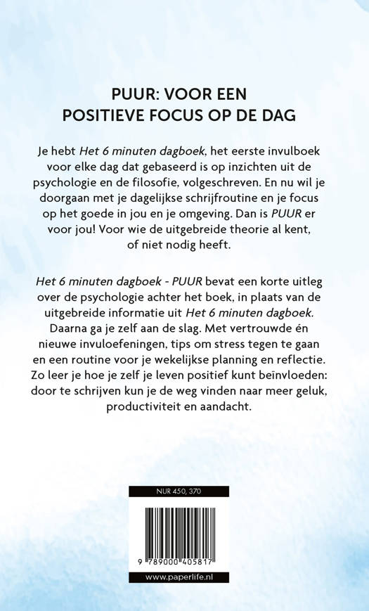 PUUR is een invulboek voor elke dag, met minder theorie voorin. Voor wie een of meerdere exemplaren van Het 6 minuten dagboek heeft gevuld en verder wil schrijven, en daarbij de theoretische uitleg niet meer nodig heeft.