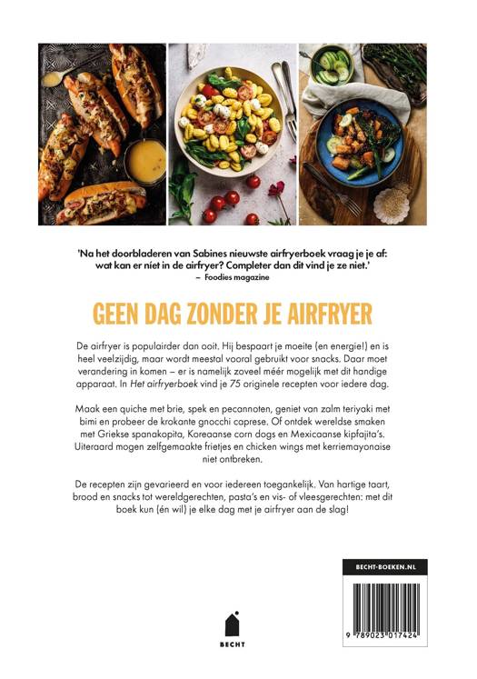 In 'Het airfryerboek' leert Sabine Koning je hoe je met een airfryer de allerlekkerste gerechten op tafel kunt zetten. Na haar twee supersuccesvolle slowcookerboeken besloot Sabine om een ander geliefd keukenapparaat in het zonnetje te zetten: de airfryer. Met dit boek bewijst ze opnieuw hoe je met haar recepten volwaardige dinergerechten uit één keukenapparaat kunt toveren. Van ovenschotels, snacks en hartige taarten tot aardappel-, rijst- en pastagerechten - ook de airfryer is ontzettend veelzijdig. Zet bijvoorbeeld binnen een mum van tijd een Texaanse traybake met spareribs op tafel, maak een spinazie-champignonquiche of ga voor sambal goreng tempé. Uit de airfryer? Ja, het kan echt! Met 'Het airfryerboek' leer je alle tips en tricks om alles uit je airfryer te halen en maak je moeiteloos heerlijke gerechten.