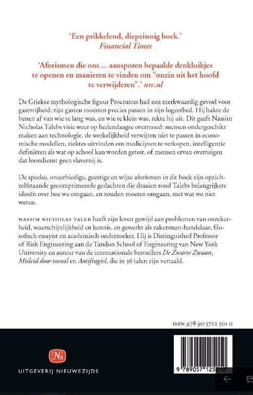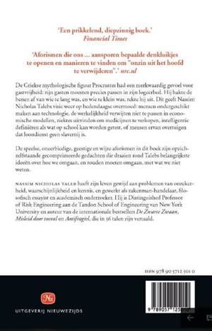 De Griekse mythologische figuur Procrustes had een merkwaardig gevoel voor gastvrijheid: zijn gasten moesten precies passen in zijn logeerbed. Hij hakte de benen af van wie te lang was, en wie te klein was, rekte hij uit. Dit geeft Nassim Nicholas Talebs visie weer op hedendaagse overmoed: mensen ondergeschikt maken aan technologie, de werkelijkheid verwijten niet te passen in economische modellen, ziektes uitvinden om medicijnen te verkopen, intelligentie definiëren als wat op school kan worden getest, of mensen ervan overtuigen dat loondienst geen slavernij is.