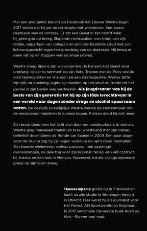 Westra hoort in de jeugd bij de top van zijn generatie tot hij terechtkomt in een wereld vol drank en drugs. Na zeven jaar afwezigheid stapt hij weer op de fiets, traint maniakaal en breekt in 2009 definitief door. Zijn tweede wielerleven verloopt succesvol, tot de depressie zijn leven gaat beheersen.
