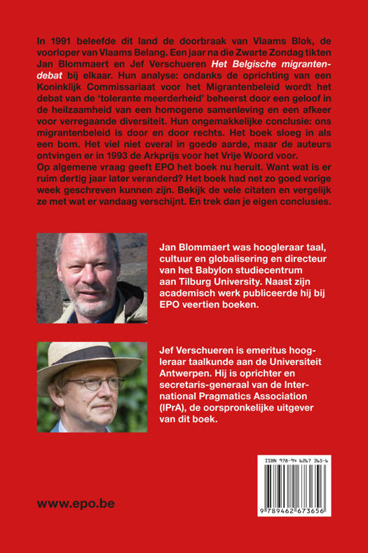 In 1991 beleefde dit land de doorbraak van Vlaams Blok, de voorloper van Vlaams Belang. Een jaar na die Zwarte Zondag tikten Jan Blommaert en Jef Verschueren Het Belgische migrantendebat bij elkaar. Hun analyse: ondanks de oprichting van een Koninklijk Commissariaat voor het Migrantenbeleid wordt het debat van de ‘tolerante meerderheid’ beheerst door een geloof in de heilzaamheid van een homogene samenleving en een afkeer voor verregaande diversiteit. Hun ongemakkelijke conclusie: ons migrantenbeleid is door en door rechts. Het boek sloeg in als een bom. Het viel niet overal in goede aarde, maar de auteurs ontvingen er in 1993 de Arkprijs voor het Vrije Woord voor. Op algemene vraag geeft EPO het boek nu heruit. Want wat is er ruim dertig jaar later veranderd? Het boek had net zo goed vorige week geschreven kunnen zijn. Bekijk de vele citaten en vergelijk ze met wat er vandaag verschijnt. En trek dan je eigen conclusies.