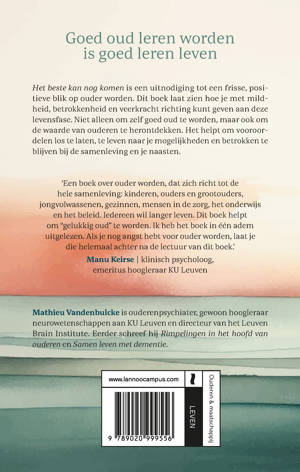 Het beste kan nog komen is een uitnodiging tot een frisse, positieve blik op ouder worden. Dit boek laat zien hoe je met mildheid, betrokkenheid en veerkracht richting kunt geven aan deze levensfase. Niet alleen om zelf goed oud te worden, maar ook om de waarde van ouderen te herontdekken. Het helpt om vooroordelen los te laten, te leven naar je mogelijkheden en betrokken te blijven bij de samenleving en je naasten.