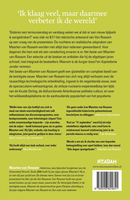 Speciale jubileum editie! Maarten van Rossem kan zich nog altijd verbazen over de twintigste eeuw. Over de reusachtige technologische ontwikkelingen, de spectaculaire welvaartsgroei, de zinloze nucleaire wapenwedloop ten tijde van de Koude Oorlog, de disfunctionele Amerikaanse politieke cultuur, en over het wildwestkapitalisme en de aanhoudende populariteit van het populisme tot in het begin van deze eeuw. Het beste van Van Rossem is een selectie uit de artikelen en boeken die hij in de afgelopen jaren schreef. Een glashelder en compleet beeld van die opzienbarende vorige eeuw.