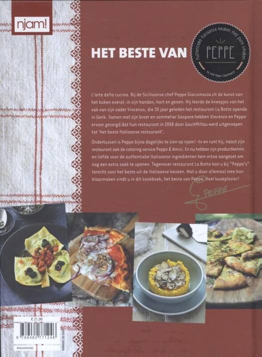 L'arte della cucina. Bij de Siciliaanse chef Peppe Giacomazza zit de kunst van het koken overal: in zijn handen, hart en genen. Hij leerde de kneepjes van het vak van zijn vader Vincenzo, die 35 jaar geleden het restaurant La Botte opende in Genk. Samen met zijn broer en sommelier Gaspare hebben Vincenzo en Peppe ervoor gezorgd dat hun restaurant in 2008 door GaultMillau werd uitgeroepen tot 'het beste Italiaanse restaurant'. Ondertussen is Peppe bijna dagelijks te zien op njam!-tv en runt hij, naast zijn restaurant ook de catering service Peppe & Amici. En nu hebben zijn productkennis en liefde voor de authentieke Italiaanse ingrediënten hem ertoe aangezet om nog een extra zaak te openen. Tegenover restaurant La Botte kan u bij "Peppe's" terecht voor het beste uit de Italiaanse keuken. Wat u daar allemaal mee kan klaarmaken vindt u in dit kookboek, het beste van Peppe. Veel kookplezier!