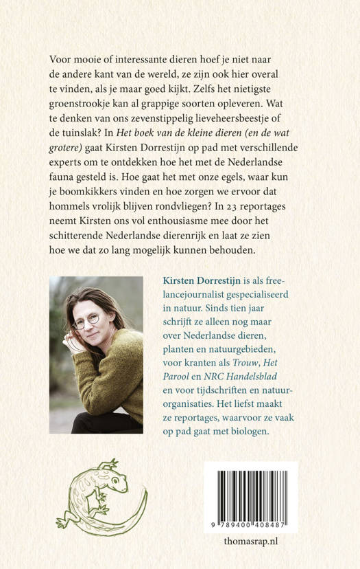 Voor mooie of interessante dieren hoef je niet naar de andere kant van de wereld, ze zijn ook hier overal te vinden, als je maar goed kijkt. Zelfs het nietigste groenstrookje kan al grappige soorten opleveren. Wat te denken van ons zevenstippelig lieveheersbeestje of de tuinslak? In Het boek van de kleine dieren (en de wat grotere) gaat Kirsten Dorrestijn op pad met verschillende experts om te ontdekken hoe het met de Nederlandse fauna gesteld is. Hoe gaat het met onze egels, waar kun je boomkikkers vinden en hoe zorgen we ervoor dat hommels vrolijk blijven rondvliegen? In 25 reportages neemt Kirsten ons vol enthousiasme mee door het schitterende Nederlandse dierenrijk en laat ze zien hoe we dat zo lang mogelijk kunnen behouden.