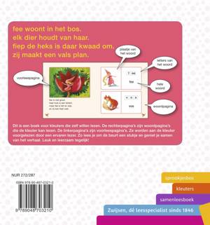 Kleuters samenleesboeken: Een samenleesboek voor kleuters. De rechterpagina’s zijn woordpagina’s die de kleuter leest. De linkerpagina’s zijn voorleespagina’s voor de ervaren lezer. Ga er eens lekker voor zitten en lees gezellig samen in dit boek. Fee woont in het bos. Elk dier houdt van haar. Fiep de heks is daar kwaad om. Zij maakt een vals plan.