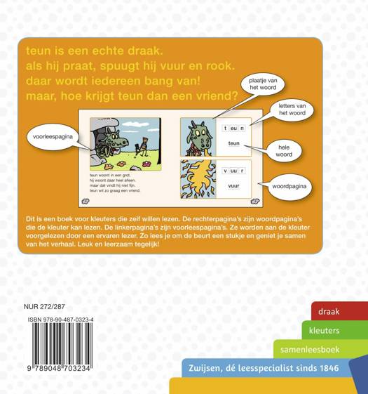 Kleuters samenleesboeken: Een samenleesboek voor kleuters. De rechterpagina’s zijn woordpagina’s die de kleuter leest. De linkerpagina’s zijn voorleespagina’s voor de ervaren lezer. Ga er eens lekker voor zitten en lees gezellig samen in dit boek. Teun is een echte draak. Als hij praat, spuugt hij vuur en rook. Daar wordt iedereen bang van! Maar, hoe krijgt Teun dan een vriend?