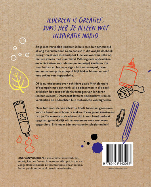 Of je nu ondersteboven schildert zoals Michelangelo of stempelt met een vork: alle opdrachten in dit boek prikkelen het creatief denkvermogen van kinderen (en hun ouders!). Daarnaast leren ze al knutselend bij en versterken de opdrachten hun motorische vaardigheden.