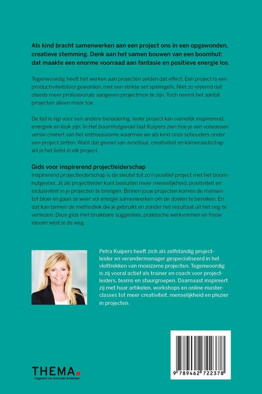 Gids voor inspirerend projectleiderschap Inspirerend projectleiderschap is de sleutel tot zo’n positief project met het boomhutgevoel. Jij als projectleider kunt besluiten meer menselijkheid, positiviteit en inclusiviteit in je projecten te brengen. Binnen jouw projecten komen de mensen tot bloei en gaan ze weer vol energie samenwerken om de doelen te bereiken. En dat kan binnen de methodiek die je gebruikt en zonder het resultaat uit het oog te verliezen. Deze gids met bruikbare suggesties, praktische werkvormen en frisse ideeën wijst je de weg.