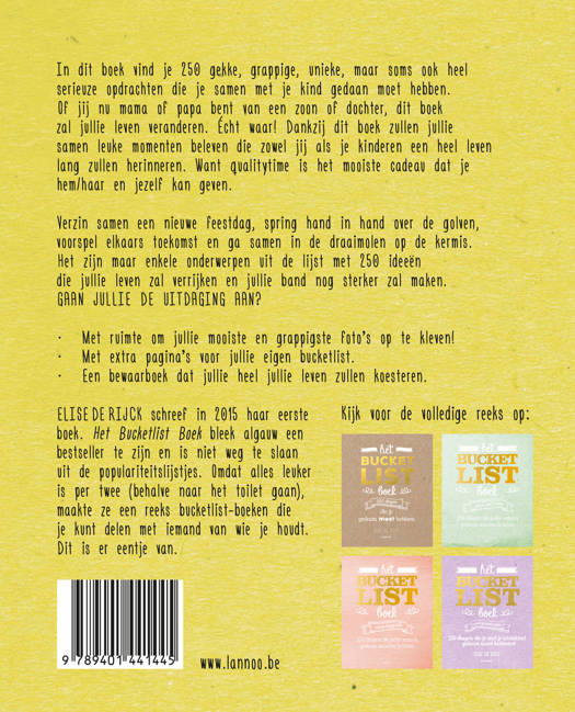In dit boek vind je 250 gekke, grappige, unieke, maar soms ook heel serieuze opdrachten die je samen met je kind gedaan moet hebben. Of jij nu mama of papa bent van een zoon of dochter, dit boek zal jullie leven veranderen. Écht waar! Dankzij dit boek zullen jullie samen leuke momenten beleven die zowel jij als je kinderen een heel leven lang zullen herinneren. Want qualitytime is het mooiste cadeau dat je hem/haar en jezelf kan geven. Verzin samen een nieuwe feestdag, spring hand in hand over de golven, voorspel elkaars toekomst en ga samen in de draaimolen op de kermis. Het zijn maar enkele onderwerpen uit de lijst met 250 ideeën die jullie leven zal verrijken en jullie band nog sterker zal maken. GAAN JULLIE DE UITDAGING AAN? - Met ruimte om jullie mooiste en grappigste foto's op te kleven! - Met extra pagina's voor jullie eigen bucketlist. - Een bewaarboek dat jullie heel jullie leven zullen koesteren.