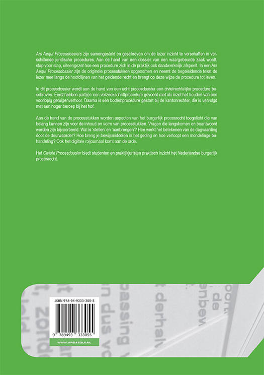 Ars Aequi Procesdossiers zijn samengesteld en geschreven om de lezer inzicht te verschaffen in verschillende juridische procedures. Aan de hand van een dossier van een waargebeurde zaak wordt, stap voor stap, uiteengezet hoe een procedure zich in de praktijk ook daadwerkelijk afspeelt. In een Ars Aequi Procesdossier zijn de originele processtukken opgenomen en neemt de begeleidende tekst de lezer mee langs de hoofdlijnen van het geldende recht en brengt op deze wijze de procedure tot leven.