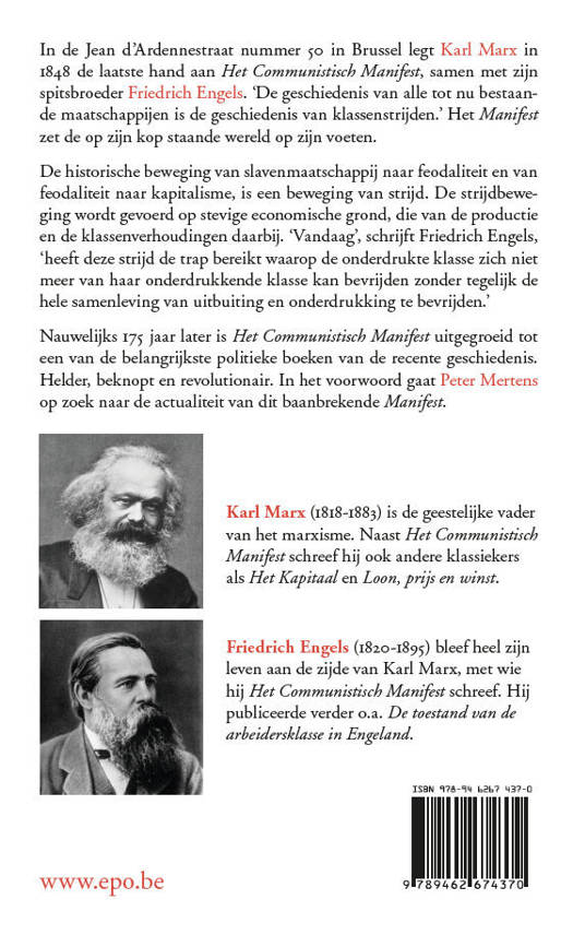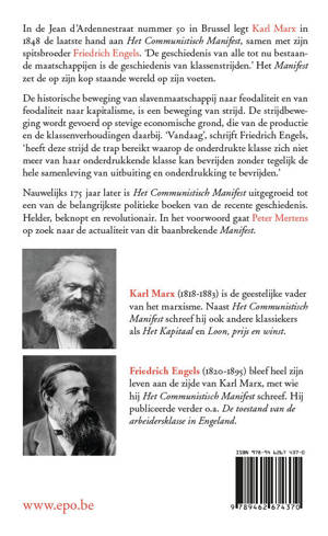 In de Jean d’Ardennestraat nummer 50 in Brussel legt Karl Marx in 1848 de laatste hand aan Het Communistisch Manifest, samen met zijn spitsbroeder Friedrich Engels. ‘De geschiedenis van alle tot nu bestaande maatschappijen is de geschiedenis van klassenstrijden.’ Het Manifest zet de op zijn kop staande wereld op zijn voeten. De historische beweging van slavenmaatschappij naar feodaliteit en van feodaliteit naar kapitalisme, is een beweging van strijd. De strijdbeweging wordt gevoerd op stevige economische grond, die van de productie en de klassenverhoudingen daarbij. ‘Vandaag’, schrijft Friedrich Engels, ‘heeft deze strijd de trap bereikt waarop de onderdrukte klasse zich niet meer van haar onderdrukkende klasse kan bevrijden zonder tegelijk de hele samenleving van uitbuiting en onderdrukking te bevrijden.’ Nauwelijks 175 jaar later is Het Communistisch Manifest uitgegroeid tot een van de belangrijkste politieke boeken van de recente geschiedenis. Helder, beknopt en revolutionair. In het voorwoord gaat Peter Mertens op zoek naar de actualiteit van dit baanbrekende Manifest.
