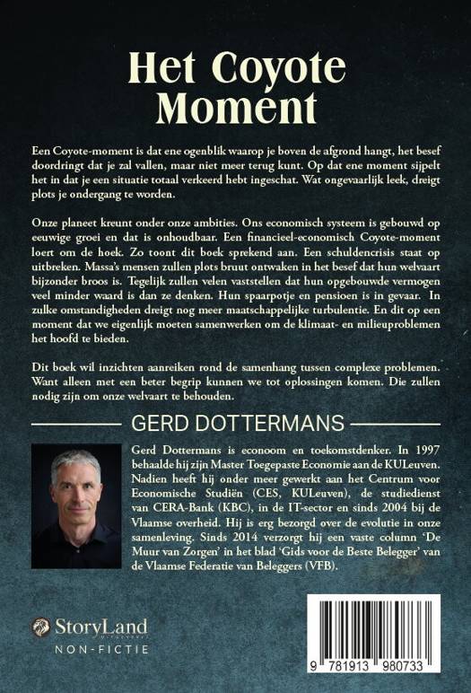 Onze planeet kreunt onder onze ambities. Ons economisch systeem is gebouwd op eeuwige groei en dat is onhoudbaar. Een financieel-economisch Coyote-moment loert om de hoek. Zo toont dit boek sprekend aan. Een schuldencrisis staat op uitbreken. Massa’s mensen zullen plots bruut ontwaken in het besef dat hun welvaart bijzonder broos is. Tegelijk zullen velen vaststellen dat hun opgebouwde vermogen veel minder waard is dan ze denken. Hun spaarpotje en pensioen is in gevaar. In zulke omstandigheden dreigt nog meer maatschappelijke turbulentie. En dit op een moment dat we eigenlijk moeten samenwerken om de klimaat- en milieuproblemen het hoofd te bieden.