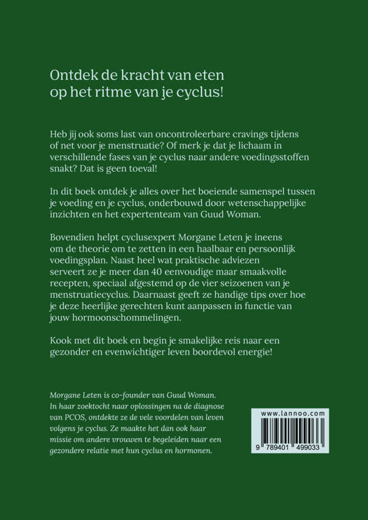 Heb jij ook soms last van oncontroleerbare cravings tijdens of net voor je menstruatie? Of merk je dat je lichaam in verschillende fases van je cyclus naar andere voedingsstoffen snakt? Dat is geen toeval! In dit boek ontdek je alles over het boeiende samenspel tussen je voeding en je cyclus, onderbouwd door de laatste inzichten van cyclusspecialiste Morgane Leten en het expertenteam van Guud Woman. Vervolgens zet je de theorie meteen om in de praktijk, in de vorm van een haalbaar en persoonlijk voedingsplan voor elk seizoen van je cyclus. Dankzij de meer dan 40 eenvoudige maar smaakvolle recepten krijgt je lichaam in elke fase de juiste voedingsstoffen binnen. Aangevuld met heel wat tips om de gerechten aan te passen aan je hormoonschommelingen, is dit kookboek je levenslange leidraad voor meer energie en vitaliteit. Kook met dit boek en begin je smakelijke reis naar een gezonder en evenwichtiger leven boordevol energie!