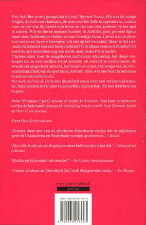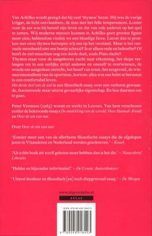 Van Achilles wordt gezegd dat hij veel 'thymos' bezat - hij was moedig, vurig, hartstochtelijk, licht ontvlambaar, een geboren krijger. Louter voor de eer was hij bereid zijn leven en dat van vele anderen op het spel te zetten. Wij modernen kunnen in Achilles geen grootse figuur meer zien; heldendom vinden we een bloedige farce. Liever dan te pronken met onze thymos beroepen wij ons op het verstand. Maar is het rationele mensbeeld niet een beetje schraal? Is er alleen rede en behoefte? Of bestaat er misschien een derde deel in de ziel, zoals Plato dacht? Thymos staat voor de aangeboren zucht naar erkenning, het diepe verlangen om in een eerlijke strijd anderen en onszelf te overwinnen, de woede om aangedaan onrecht, het besef van ernst, het eergevoel, de winnaarsmentaliteit van de sportman, kortom, alles wat ons belet te berusten in een comfortabel leven. Het derde deel van de ziel is een filosofisch essay over een verloren gewaande, fascinerende maar uiterst gevaarlijke eigenschap. En hoe daarmee om te gaan.