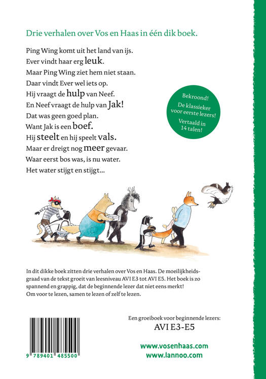 In dit dikke boek zitten drie verhalen over Vos en Haas. De moeilijkheidsgraad van de tekst groeit van leesniveau AVI E3 tot AVI E5. Het boek is zo spannend en grappig, dat de beginnende lezer dat niet eens merkt!
