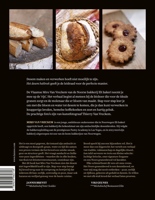 De Vlaamse Miro Van Vreckem van de Noorse bakkerij Elt bakeri neemt je mee op de 'rijs'. Het verhaal begint al meteen bij de bioboer die voor de ideale granen zorgt en de molenaar die er bloem van maakt. Stap voor stap leer je om met die bloem en water tot desem te komen, die je dan kunt verwerken in knapperige broden, hemelse koffiekoeken en zoet en hartig gebak.