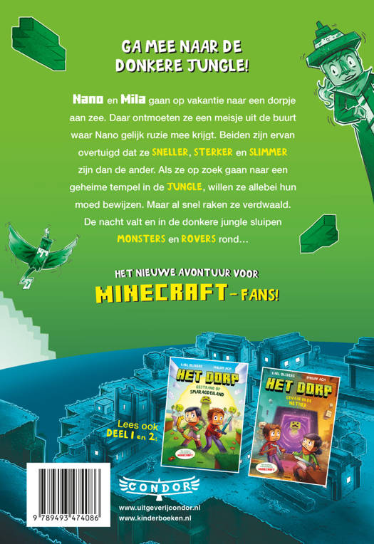 In Verdwaald in de jungle beleven Nano en Mila een nieuw avontuur als ze op vakantie gaan naar een dorpje aan zee. Daar ontmoeten ze een meisje uit de buurt waar Nano gelijk ruzie mee krijgt. Allebei zijn ze ervan overtuigd dat ze sneller, sterker en slimmer zijn dan de ander. Als ze op zoek gaan naar een geheime tempel in de jungle, willen ze ieder hun moed bewijzen. Maar al snel raken ze verdwaald… De nacht valt en in de donkere jungle sluipen monsters en rovers rond! In dit derde deel van de serie Het Dorp kunnen fans van Minecraft zich laten meeslepen door het nieuwe avontuur van Nano en Mila!