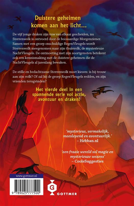 In 'Vleugels van vuur 4 - Het duistere geheim' is de nogal timide jonge draak Sterrenwolk samen met een groep onschuldige RegenVleugels ontvoerd door de boosaardige Morgenziener. Hij wordt meegenomen naar zijn thuisvolk, de mysterieuze NachtVleugels. Maar de ontmoeting met zijn soortgenoten betekent voor Sterrenwolk ook een kennismaking met de duistere geheimen die de NachtVleugels al jarenlang bewaken. De stille en bedachtzame Sterrenwolk moet kiezen: zal hij trouw zijn aan zijn volk? Of zal hij de groep RegenVleugels redden en zijn vrienden terugvinden? De allesvernietigende drakenoorlog woedt eindeloos voort, en zijn keuzes zullen het verloop ervan voor altijd veranderen.