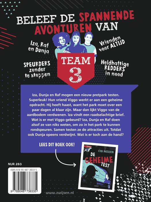 Spannende detectiveserie Team 3 van thrillerauteur Cis Meijer voor kinderen vanaf 9 jaar. Dit is het tweede boek uit de serie. Beleef alle avonturen van Raf, Dunja en Iza. In Het duistere pretpark mogen ze een nieuw pretpark testen. Superleuk! Hun vriend Viggo werkt er aan een geheime opdracht. Hij heeft haast, want het park moet over een paar dagen al klaar zijn. Maar dan lijkt Viggo van de aardbodem verdwenen. Iza vindt een raadselachtige brief. Wat is er met Viggo gebeurd? Iza, Dunja en Raf doen alsof ze van niks weten, om zo in het park te kunnen rondspeuren. Samen testen ze de attracties uit. Totdat ook Dunja opeens verdwijnt. Wat is er toch aan de hand?